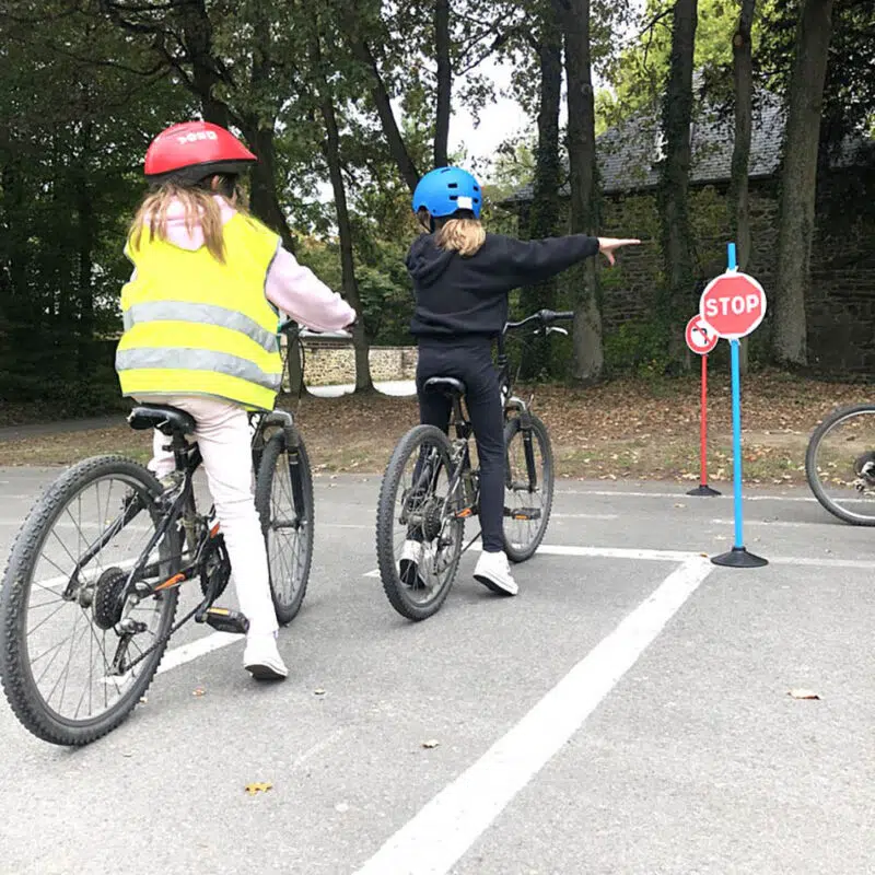 Découvrir la mobilité à vélo en milieu sécurisé. Il s’agit de savoir rouler en groupe, communiquer pour informer les autres d’une volonté de changer de direction, et découvrir les panneaux du code de la route.